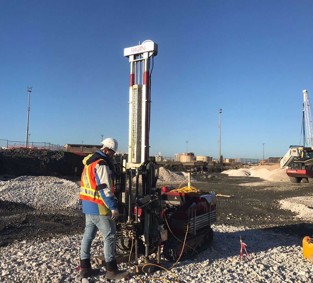With CPT static testing (Cone Penetration Test), a conical point with a 60° opening is advanced at a constant speed through the ground: the column of shafts that enables the tip to move forwards is protected by a covering tubing with the same diameter as the tip. The tip, the pipe and both together are penetrated, respectively measuring tip resistance (Rp), lateral resistance (RI) and total resistance (Rt). Said resistance values are correlated with the mechanical characteristics of penetrated ground.